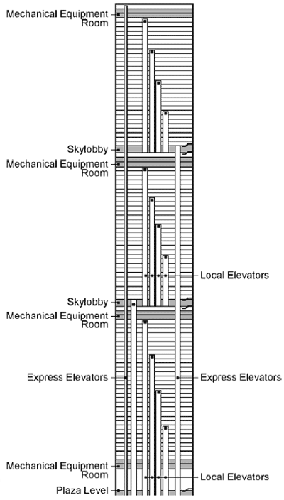 In groen de route naar etage 63: eerst per express naar verdieping 44, dan overstappen op een lift naar nummer 63.